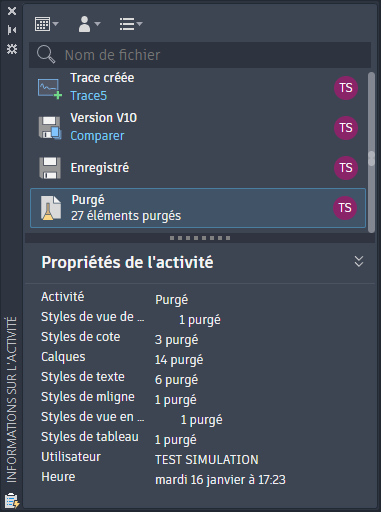 Suivez l’évolution de vos dessins et comparez l’historique des dessins à l’aide d’Informations sur l’activité, une palette qui enregistre les activités et les filtre par type, utilisateur et date.