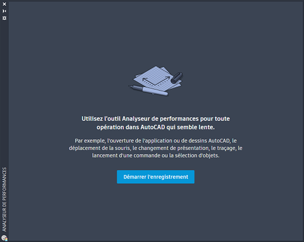 Utilisez l'Analyseur de performances pour diagnostiquer les opérations dans AutoCAD qui semblent lentes ou ne répondent pas.