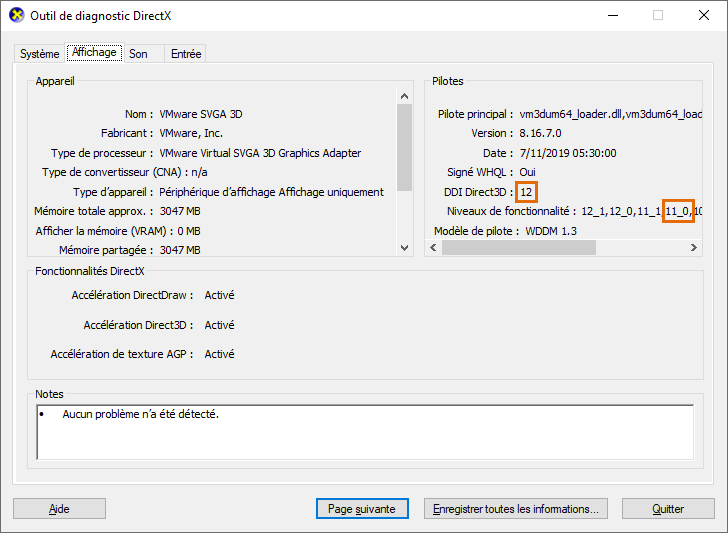 Le système graphique moderne nécessite du matériel et des logiciels compatibles avec DirectX 12. Le niveau de fonctionnalité minimum DirectX 12 est 11_0. Vous pouvez vérifier que ces conditions sont respectées en exécutant la commande DXDIAG à partir du menu Démarrer de Windows. Voici un exemple de système qui répond aux exigences :