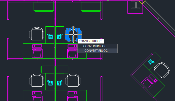 -CONVERTIRBLOC : à l'invite de commande, convertit les entités sélectionnées et les occurrences identiques en blocs.