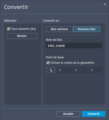 CONVERTIRBLOC : ouvre la boîte de dialogue Convertir et convertit la géométrie sélectionnée et les occurrences identiques en blocs.