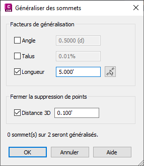 La figure 16 illustre la boîte de dialogue de configuration de l'opération de généralisation. Vous pouvez indiquer les facteurs de généralisation à appliquer, ajuster les valeurs numériques et prévisualiser les résultats avant la validation. Cliquez sur le bouton Aide de cette boîte de dialogue pour consulter la rubrique d'aide relative à la généralisation et à l'utilisation optimale de ces éléments.