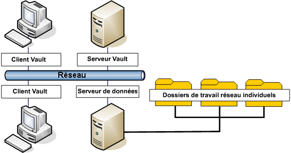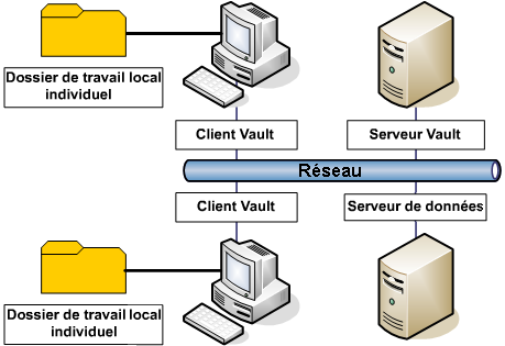 Lorsque les dossiers de travail sont stockés sur des ordinateurs locaux, comme illustré à la figure 7, le trafic du réseau est réduit et les membres de l'équipe peuvent travailler hors ligne de l'extérieur ou à partir d'un bureau à domicile. Les utilisateurs génèrent du trafic sur le réseau uniquement lorsqu'ils archivent ou extraient des fichiers du coffre-fort.