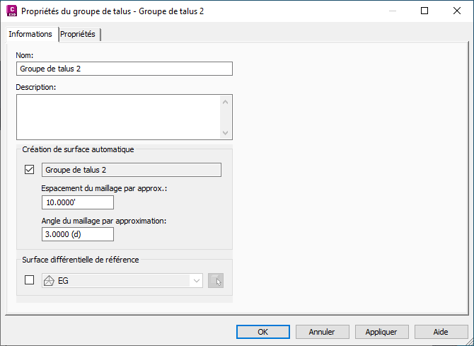 Pour corriger la triangulation de l'arc, il faut définir une valeur plus précise pour l'espacement du maillage par approximation dans le groupe de talus. Comme indiqué dans la figure 26, ce paramètre peut être difficile à trouver dans la boîte de dialogue Propriétés des groupes de talus, car il ne peut être défini que si l'option Création de surface automatique est activée. Toutefois, ce paramètre est également utilisé pour l'option Créer une surface dissociée et pour la triangulation du talus de remplissage. Il est recommandé d'activer l'option Création de surface automatique, de passer la valeur par défaut de l'espacement du maillage par approximation de 10 pieds à 1 pied, puis de désactiver à nouveau l'option initiale. Vous devez cliquer sur Appliquer après avoir activé l'option Création de surface automatique afin d'appliquer les paramètres modifiés.
