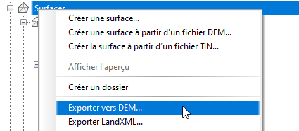 Autodesk Civil 3D vous permet d'exporter des fichiers DEM à partir d'une surface. Lors de l'exportation, vous pouvez développer l'espacement de la grille pour réduire la taille du fichier. La figure 3 illustre la sélection du menu utilisée pour démarrer le processus d'exportation.