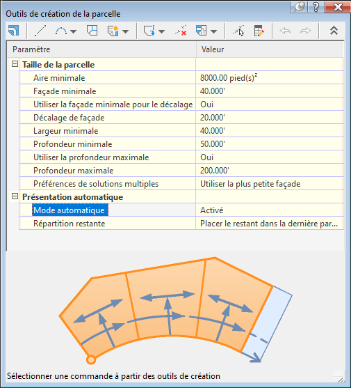 Vous pouvez utiliser les outils de création de parcelle pour procéder à la division automatique ou semi-automatique des parcelles existantes. Le mode automatique vous permet d'utiliser les outils de création de parcelle pour créer automatiquement et prévisualiser plusieurs parcelles, qui occuperont l'aire disponible. Si vous désactivez le mode automatique, les outils de création conçoivent de nouvelles parcelles, une par une.