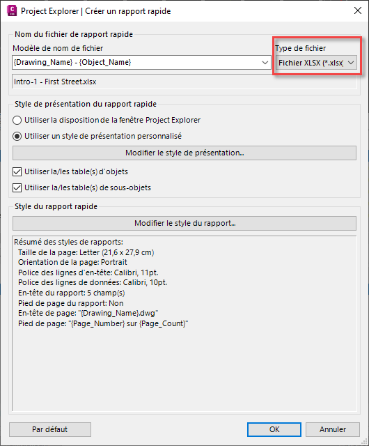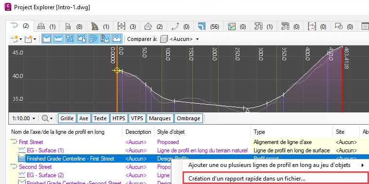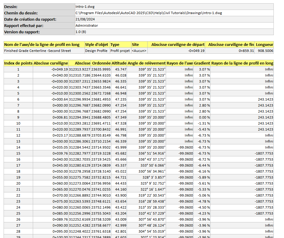 Ce didacticiel explique comment utiliser Project Explorer pour générer au format PDF un rapport simple Civil 3D sur les axes/lignes de profil en long. Vous pouvez ensuite écrire le même rapport dans un fichier Excel XLSX.