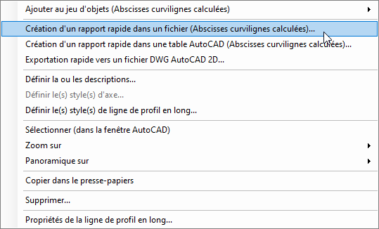 Vérifiez que l’onglet de sous-objet Abscisses curvilignes calculées est sélectionné, puis cliquez avec le bouton droit de la souris sur la ligne de profil en long sélectionnée et sélectionnez Création d’un rapport rapide dans un fichier (Abscisses curvilignes calculées) dans le menu contextuel.