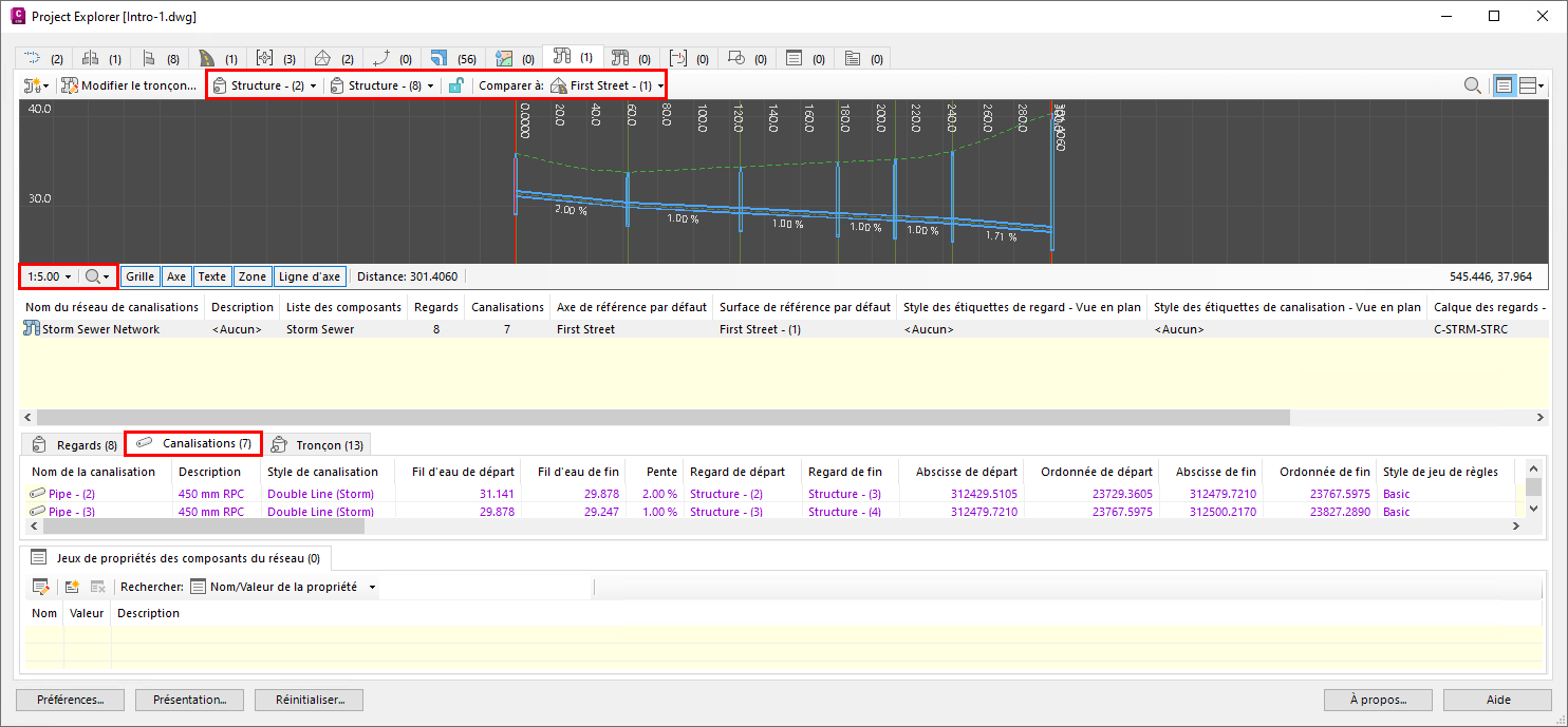 - Définissez le facteur d’échelle verticale du dessin de profil en long du réseau de canalisations sur 1:10 pour mieux voir les modifications que vous allez apporter à la pente de la canalisation.