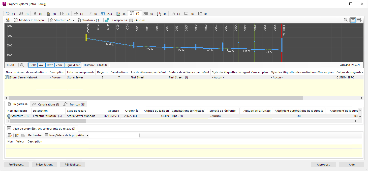 Certaines étapes ultérieures de ce didacticiel dépendent de la définition d’une surface de référence pour tous les regards et canalisations de ce réseau de canalisations. Project Explorer permet de définir, en une seule opération, la surface de référence de plusieurs composants d’un réseau de canalisations.