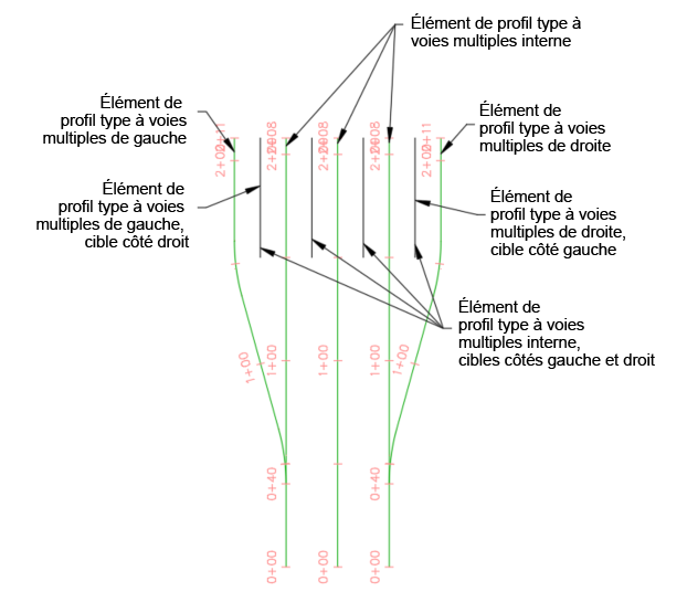 L'élément de profil type Voies_Multiples_Internes est utilisé pour une voie ferrée unique incluant des traverses, un ballast, un sous-ballast et deux autres couches ou matériaux qui peuvent être utilisés pour la couche de matériau et le remblai du sol.