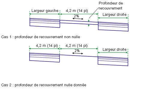 En mode d'édition, cet élément de profil type est associé à n'importe quel point. La couche de recouvrement présente une profondeur uniforme avec une largeur de 4.2 mètres ou 14 pieds pour une pente à -2 %. Les voies d'élargissement se prolongent à partir des bords du recouvrement pour des largeurs et des profondeurs spécifiées et une pente à -2 %.