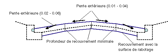Si les liens de recouvrement ne sont pas assez profonds, la profondeur du recouvrement est augmentée pour atteindre les pentes minimum. S'il en résulte une trop grande différence de dévers, des ajustements et des rabotages supplémentaires peuvent être prévus. Le diagramme suivant illustre le processus de recouvrement dans le cas d'un rabotage.