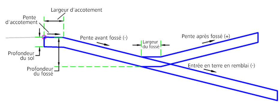 | Elevation | Permet de remplacer l'altitude du fond du fossé. Les types d'objet suivants peuvent être utilisés comme cibles pour indiquer l'altitude : lignes de profil, polylignes 3D, lignes caractéristiques du terrain ou figures de topographie. | Facultatif |