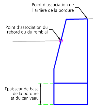Le point initial est défini sur le point d'association. Les points, les liens et les formes de la bordure et du caniveau sont générés en fonction du type de bordure sélectionné. La base est ensuite placée sous la bordure et sous le caniveau.
