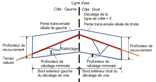 | Bord intérieur gauche du décalage de la voie existante cible | Le nom de l'objet définissant le décalage du point d'échantillonnage du bord intérieur gauche est utilisé pour calculer la pente de la surface existante. Les types d'objet suivants peuvent être utilisés comme cibles pour indiquer ce décalage : axes, polylignes, lignes caractéristiques ou figures de topographie. | Non |