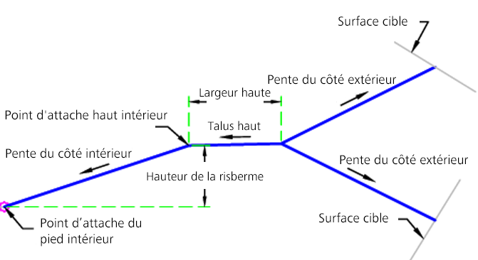 | Point d'attache | Point d'attache à partir duquel la risberme sera créée | Pied intérieur/Haut intérieur | Pied intérieur |