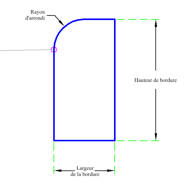 Les liens de la bordure sont insérés en fonction des cotes des paramètres d'entrée. Toutes les cotes doivent être des valeurs positives, non nulles pour obtenir les meilleurs résultats. Les paramètres sont examinés pour vérifier si le rayon entré donnera un résultat correct.