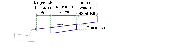 Le point d'association se situe sur le bord intérieur du boulevard intérieur. L'élément de profil type TrottoirUrbain est par défaut associé à l'arrière d'une bordure ou au bord de la chaussée.