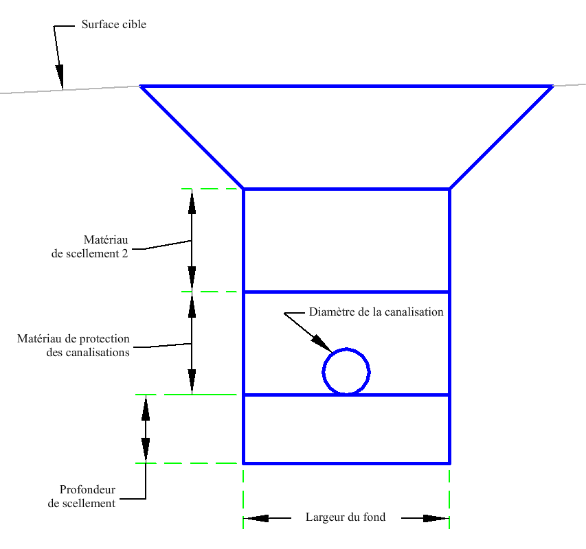 L'altitude du bas du fossé est calculée selon l'altitude du profil projet, moins la moitié du diamètre de la canalisation et la profondeur de scellement. Le lien du fond du fossé horizontal est placé symétriquement par rapport au décalage du point d'association à cette altitude. La profondeur du matériau de protection de la canalisation est utilisée pour placer le matériau autour de la canalisation. Au-dessus du matériau de protection de la canalisation se trouve le Matériau2 pour placer le matériau au-dessus de la canalisation. Les pentes de talus sont prolongées vers le haut jusqu'à la surface existante. Le lien de scellement horizontal est placé à la profondeur spécifiée au-dessus du fond de la tranchée.