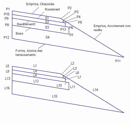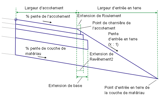 Les liens de la surface de référence, de Roulement et Revêtement2 sont insérés parallèlement à la surface finale pour des profondeurs spécifiées. Si les valeurs d'extension des calques sont non nulles, chaque couche est prolongée pour la distance spécifiée au-delà du point de charnière de l'accotement. Si une couche se prolonge au-delà de la pente d'entrée en terre, elle se termine à l'intersection de la pente d'entrée en terre. Chaque couche doit avoir une largeur égale ou supérieure à celui situé au-dessus.