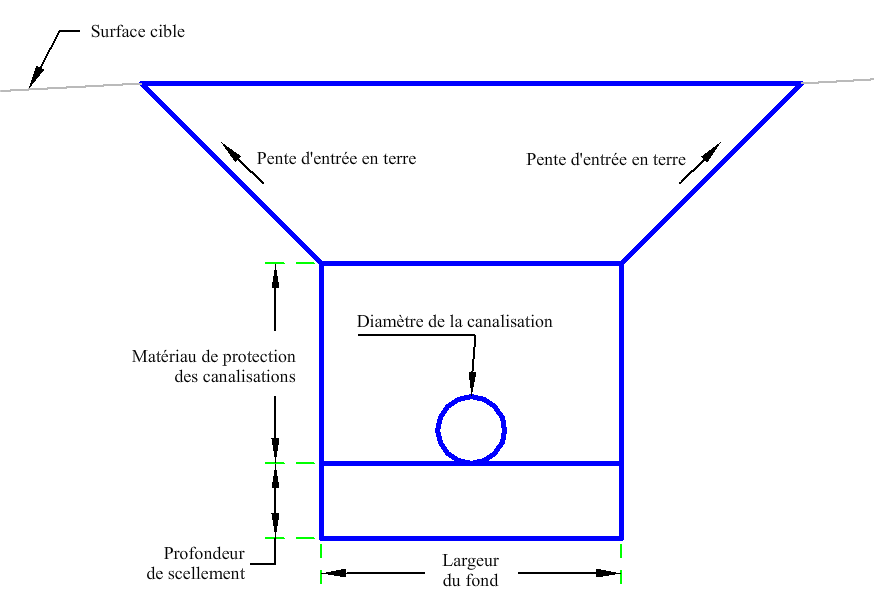 | Profondeur du matériau de la protection de la canalisation | Profondeur du scellement de la canalisation sur le fil d'eau de la canalisation. | Numérique, positive |