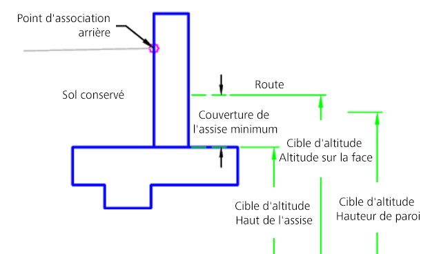 Si la cible Altitude sur la face est définie, l'altitude est utilisée. Si la cible Altitude sur la face n'est pas définie, la valeur utilisée est celle du haut de l'assise additionnée à la valeur de l'assise minimum. La cible d'altitude Haut de l'assise est utilisée pour déterminer la hauteur physique du mur de soutènement. L'assise est construite à l'aide des cotes du plan standard selon la cible de hauteur du mur.