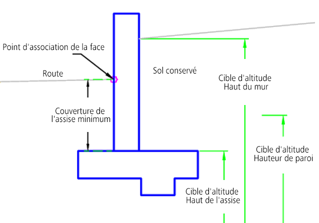 | Altitude sur la face | Permet de contrôler un point d'altitude sur la face du mur lorsque le point d'association est défini sur l'arrière. Les types d'objet suivants peuvent être utilisés comme cibles pour indiquer l'altitude : lignes de profil, polylignes 3D, lignes caractéristiques du terrain ou figures de topographie. | Facultatif |