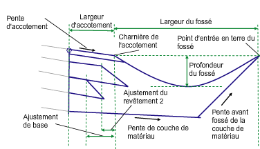 | Pente avant fossé de la couche de matériau | Valeur de la pente avant fossé de la couche de matériau à lier dans le haut du fossé. | Numérique, positive | 2 ( : 1) |