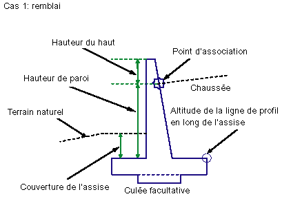 Cet élément de profil type peut être inséré sur les côtés droit ou gauche. Le point d'association est différent selon qu'il s'agit d'un remblai ou d'un déblai. Dans le cas d'un remblai, le point d'association est la ligne d'intersection entre la surface finale et la face intérieure du mur, en dessous du haut du mur, à une distance égale au paramètre Hauteur du haut. Dans le cas d'un déblai, le point d'association est la ligne d'intersection entre la surface finale et la face intérieure, au-dessus du haut de l'assise, à une distance égale au paramètre Couverture de l'assise. La hauteur de la paroi est déterminée à partir des paramètres Profil ou Hauteur de paroi spécifiés.