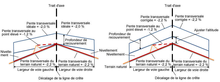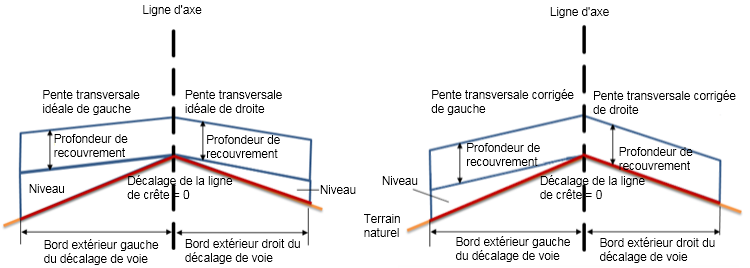 La valeur du dévers de la voie extérieure ou intérieure remplacera celle de la pente transversale idéale. Les valeurs de la pente transversale corrigée de la couche de recouvrement seront définies sur la base de la table de dévers de la ligne de profil en travers et non en fonction de la pente transversale idéale.