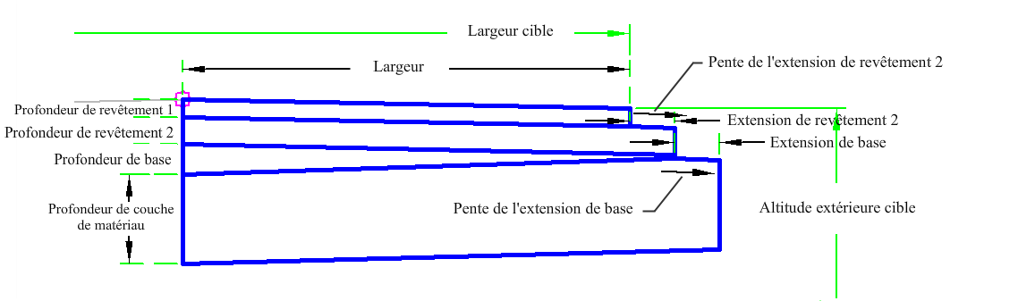 La surface finale de l'accotement est insérée en fonction de la largeur de l'accotement indiquée et de la pente de l'accotement par défaut à partir du point d'association. Les points Revêtement2 et les liens sont alors dessinés. Une extension Revêtement2 est fournie à l'aide des paramètres d'entrée. Les points et liens de base, y compris l'extension, sont calculés à l'aide des paramètres d'entrée. Les points, liens et la forme de la couche de matériau, y compris l'extension, sont calculés à l'aide des paramètres d'entrée.