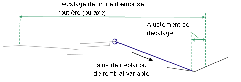 Valeur +/- ajoutée au décalage de la limite d'emprise routière. Une valeur d'ajustement négative déplace le point d'entrée en terre à l'intérieur de la limite d'emprise routière. Une valeur positive le déplace à l'extérieur de cette limite. |