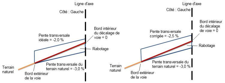 La valeur de la pente transversale corrigée est toujours égale à celle de la pente du terrain naturel.
