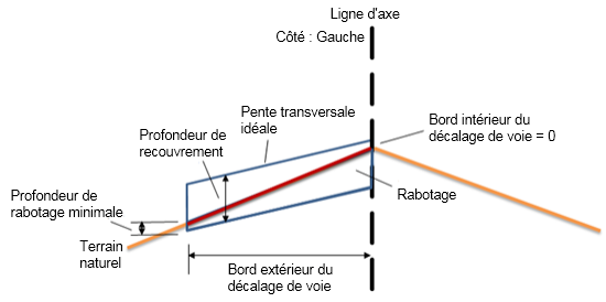Remarque : Si l'option Dévers de la voie intérieure/extérieure est sélectionnée, mais qu'aucune table de dévers n'est définie pour l'axe du projet 3D, la pente transversale idéale sera utilisée à la place.