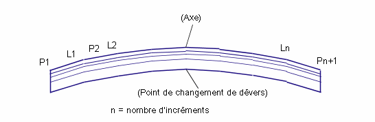 Le centre de la ligne de référence des ordonnées est calculé en soustrayant le paramètre Hauteur de dévers du point d'association. Les bords de chaussée gauche et droit sont ensuite calculés en appliquant les paramètres Largeur et Pente de façon symétrique autour du point d'association. Les ordonnées de la courbe parabolique sont calculées à intervalles pairs le long de la ligne de référence des ordonnées et des liens de ligne droite sont ajoutés pour se connecter aux points d'ordonnées. Des surfaces parallèles sont insérées pour Roulement, Revêtement2, Base et Couche de matériau à partir des profondeurs données.