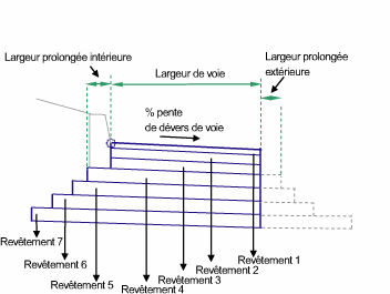 Chaque couche possède ses propres options d'extension sur l'intérieur comme sur l'extérieur. Les extensions intérieures et extérieures indiquent la largeur supplémentaire sur l'intérieur ou sur l'extérieur par rapport à la couche de chaussée située immédiatement au-dessus.