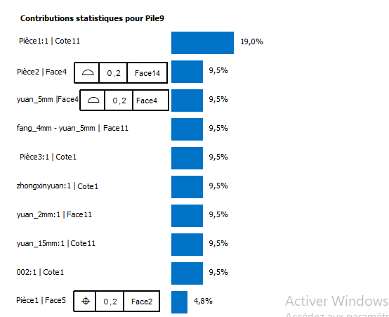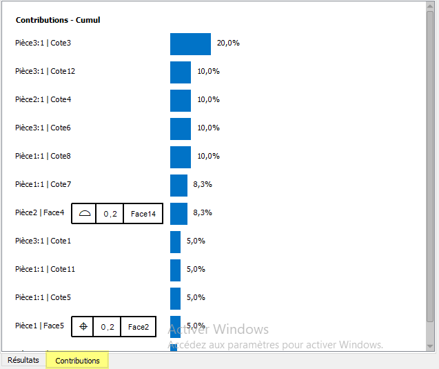 Vous pouvez également afficher la contribution de chaque cote en sélectionnant l'onglet Contributions en bas du tableau pour afficher le graphique des contributions. Ces informations peuvent vous aider à identifier la tolérance à réduire en premier si une variation trop importante est envisagée. Les cotes et les tolérances qui ont un impact sur la chaîne de cotes et leur contribution relative sont triées par ordre de grandeur, de la plus grande à la plus petite.