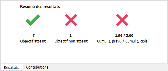Le volet Résultat se trouve en bas du panneau d'analyse de la tolérance. Lorsqu'il existe plusieurs chaînes de cotes, mais qu'aucune n'est sélectionnée, le volet de résultats affiche un résumé du nombre d'objectifs atteints ou non et une analyse de qualité cumulative qui utilise l'indicateur de qualité choisi et spécifié dans les paramètres.