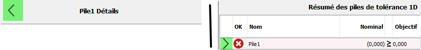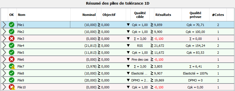- OK : une coche dans un cercle vert indique que les objectifs de l’analyse sont atteints. Une croix (X) dans un cercle rouge indique que les objectifs ne sont pas atteints. Un point d'exclamation dans un triangle jaune indique que la chaîne de cotes contient une influence 2D ou 3D.