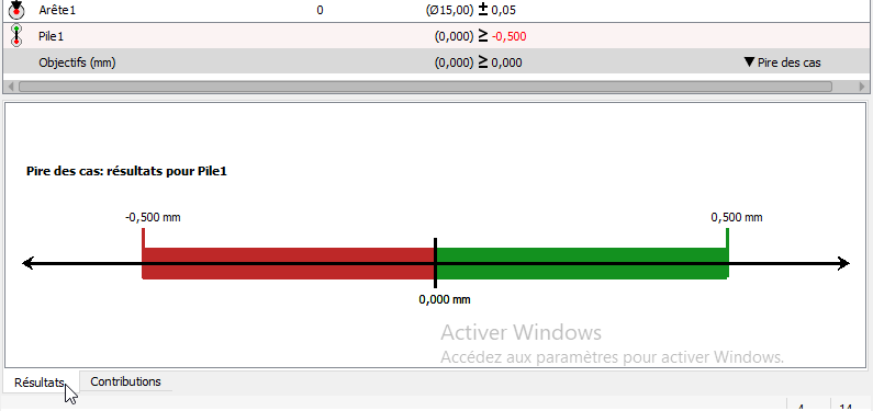 - Résultats : résultats de l’analyse de la chaîne de cotes selon le niveau de qualité cible défini. Les résultats sont présentés au même format que celui utilisé pour la définition des objectifs (±, +/-, Limites, etc.).