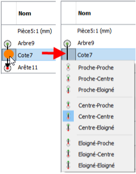 Lorsque les fonctions au-dessus et en dessous de la cote sont des fonctions de taille, plusieurs options s'offrent à vous. Le premier groupe indique si l'origine de la cote doit être rattachée au côté Proche, Centre ou Eloigné de la fonction, directement au-dessus de la cote. Le deuxième élément sert à l'attachement à la fonction directement sous la cote. Si une seule de ces fonctions est une fonction de taille, seules trois options sont disponibles.