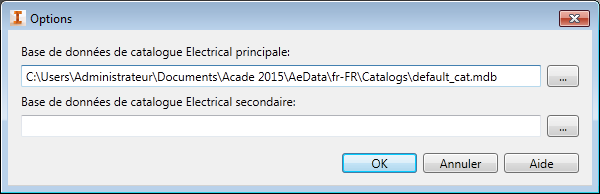 Le navigateur de catalogues Electrical est configuré par défaut sur le fichier default_cat.mdb installé avec AutoCAD Electrical. Vous souhaiterez peut-être référencer une autre base de données de catalogue issue du navigateur de catalogues Electrical, telle qu'une base de données propre à un projet donné.