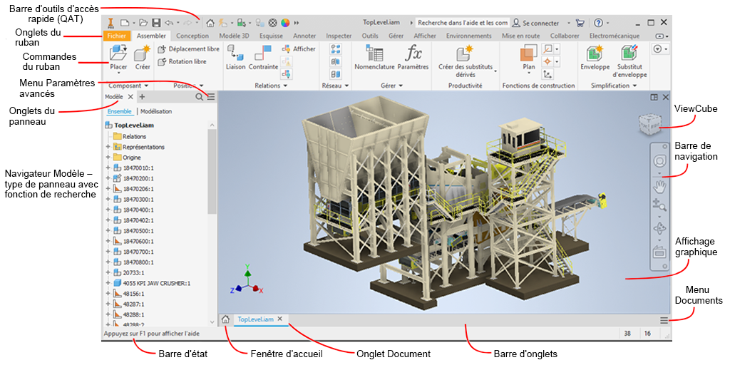 Navigateur Modèle : un panneau qui contient le composant, le dessin ou la présentation ouvert dans la fenêtre active. Le navigateur peut être ancré dans n'importe quelle fenêtre ou flotter dans l'affichage.