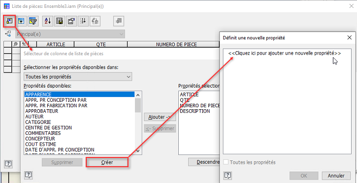 - Dans la boîte de dialogue Sélecteur de colonne de liste de pièces, cliquez sur Nouvelle propriété.