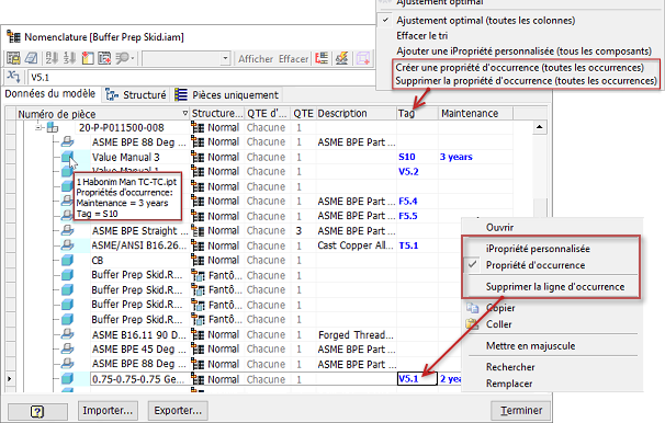 - Supprimez les propriétés d’occurrence en les remplaçant par des iPropriétés personnalisées dans la boîte de dialogue Nomenclature.