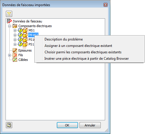 Répétez l'opération pour chaque composant que vous souhaitez insérer dans les données de câble et de faisceau importées.