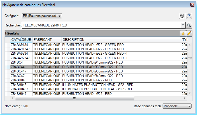 Si un catalogue est affecté à la pièce, la valeur du catalogue est présélectionnée dans le navigateur de catalogues Electrical.
