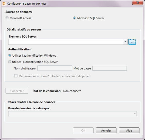 Spécifiez le type de base de données pour la source des informations de catalogue.