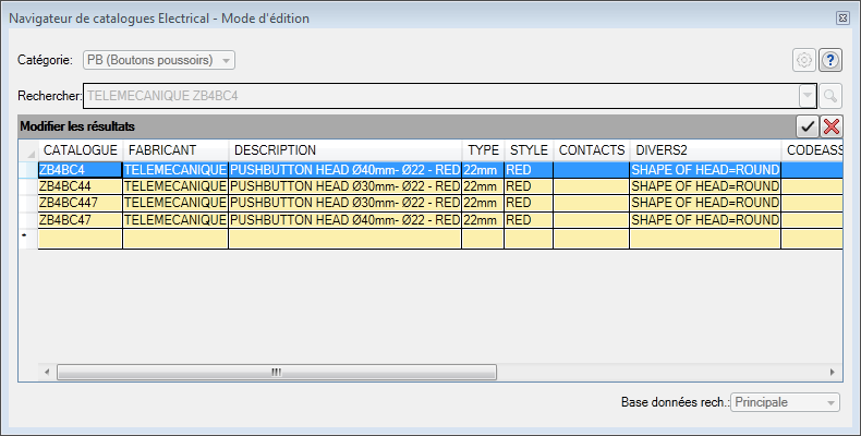Modifiez la base de données de catalogue, y compris les informations de base du catalogue, ainsi que les listes de broches, les propriétés de borne et les listes de conducteurs de câbles associées.